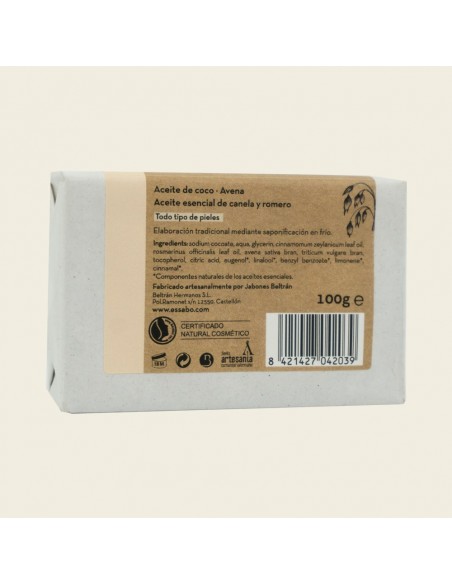 Avena, aceite esencial de canela y romero. Base de aceite de coco.
